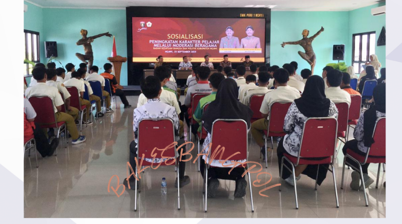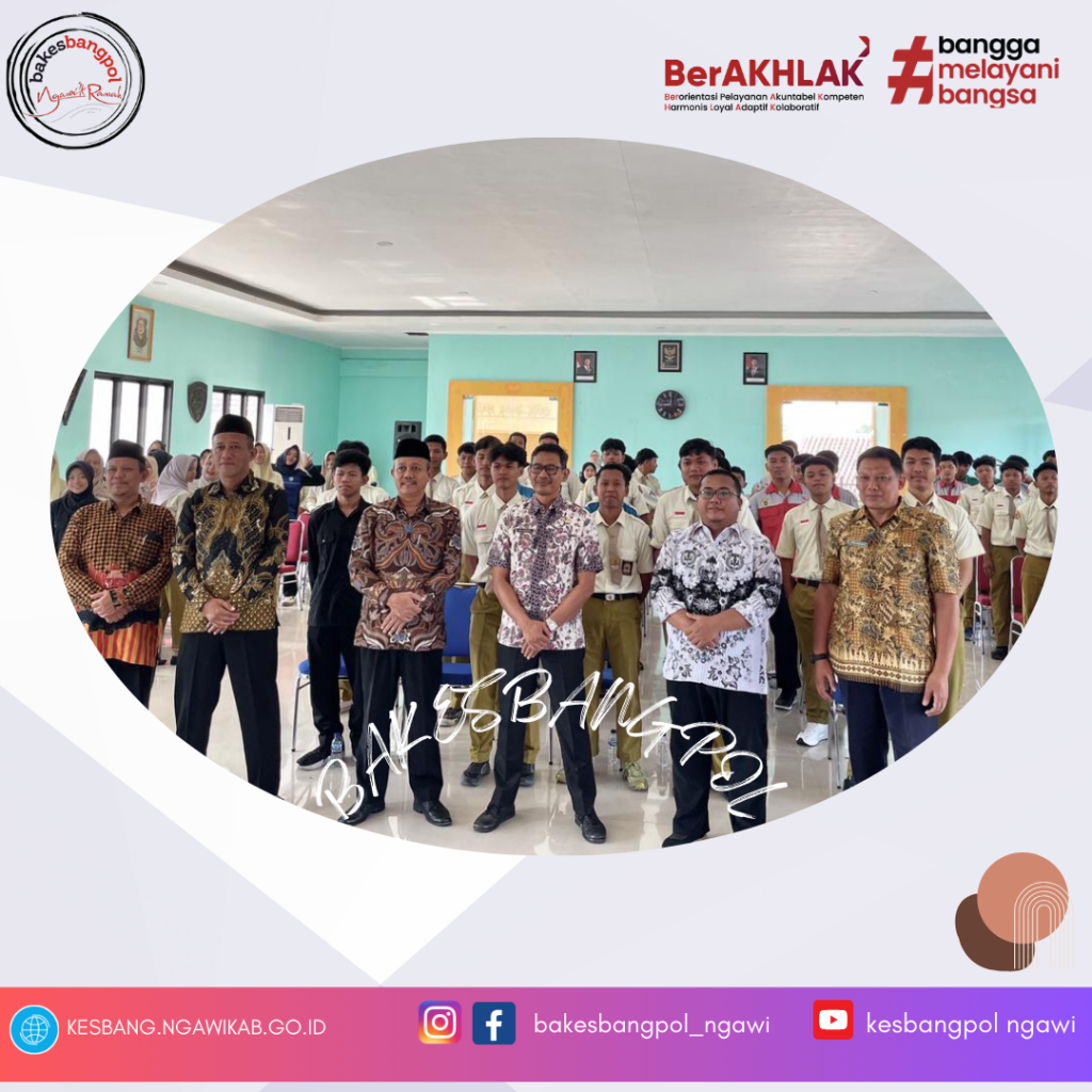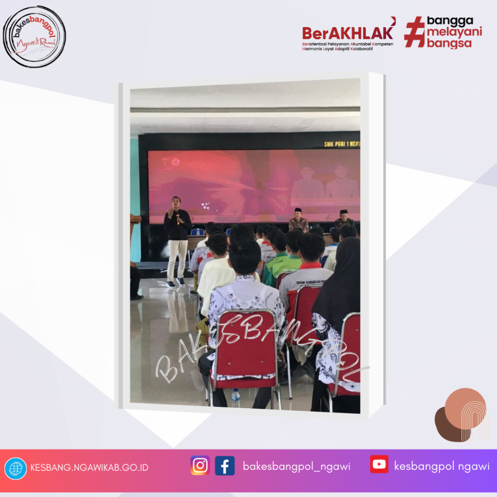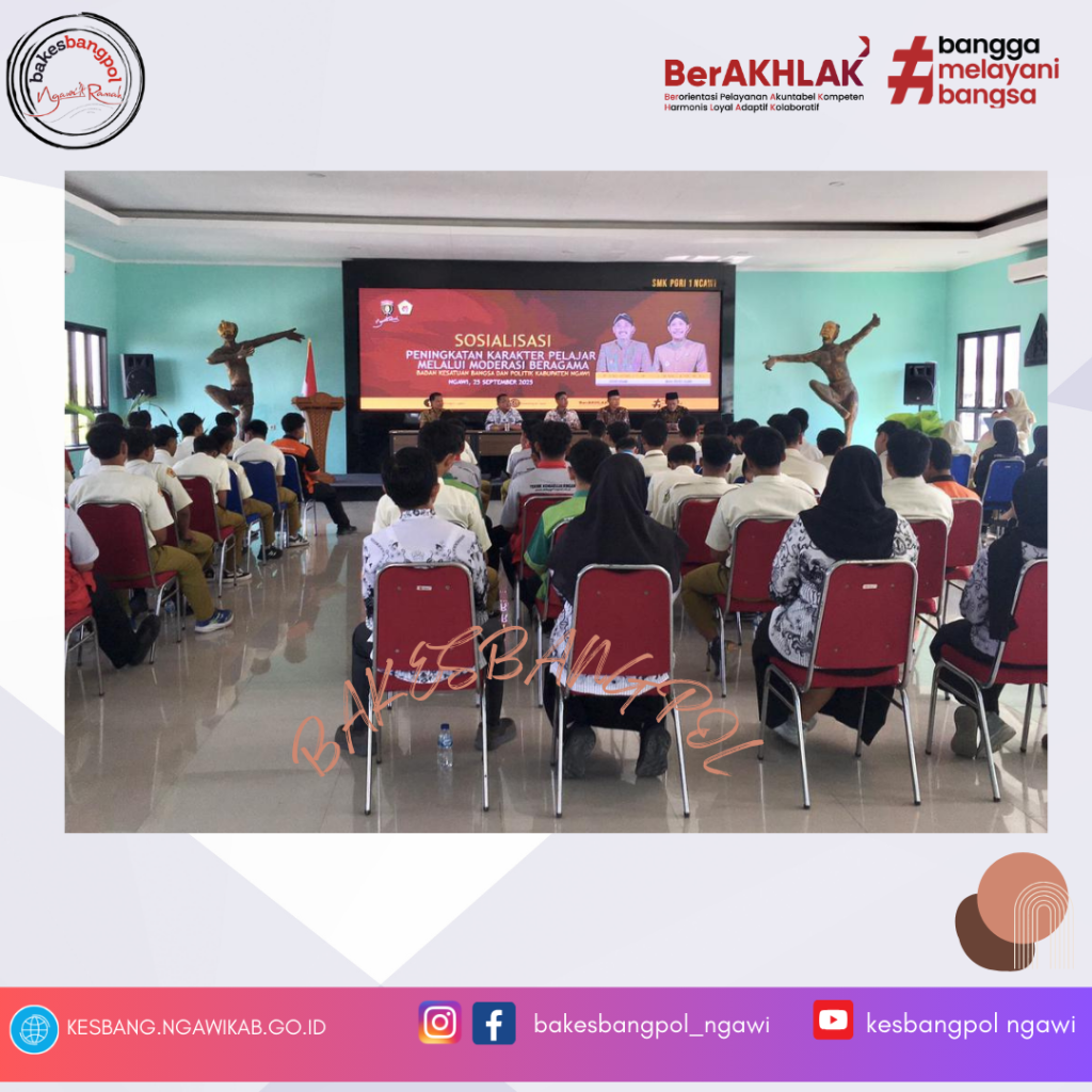 (Kamis, 25/9), Pemerintah Kabupaten Ngawi melalui Badan Kesatuan Bangsa dan Politik berkolaborasi dengan Kepala Sekolah dan Jajaran Tenaga Pendidik SMK PGRI 1 Ngawi melaksanakan kegiatan Sosialisasi Kerukunan Umat Beragama dengan tema Peningkatan Karakter Pelajar melalui Moderasi Beragama dengan jumlah peserta sebanyak delapan Guru dan 115 siswa-siswi.